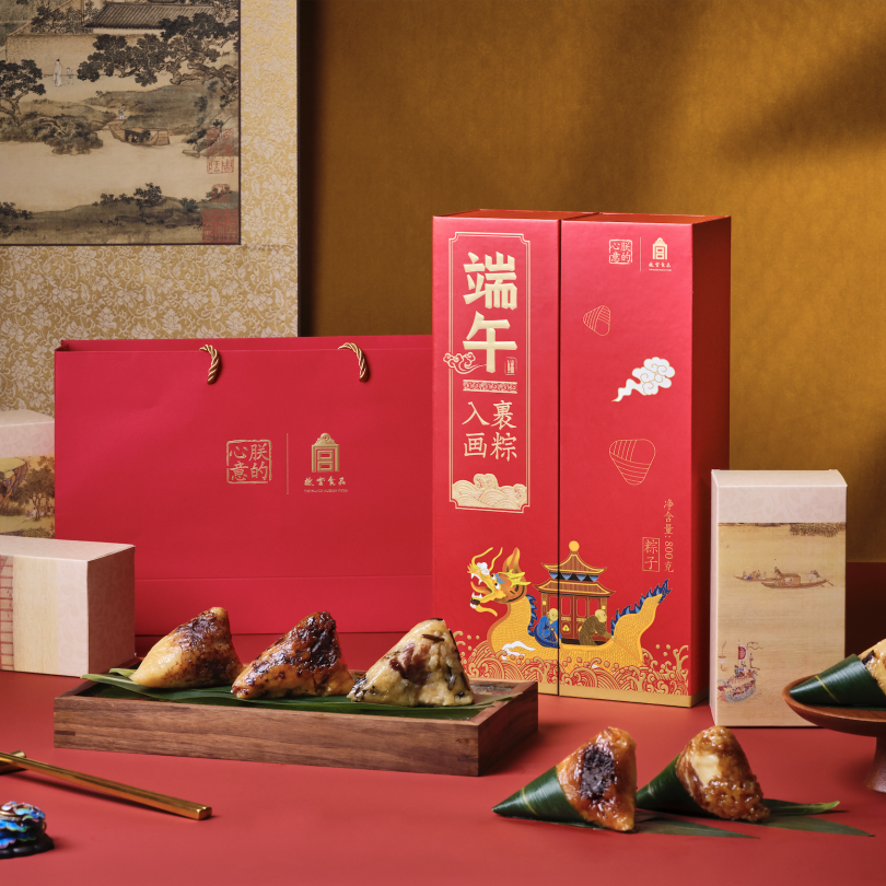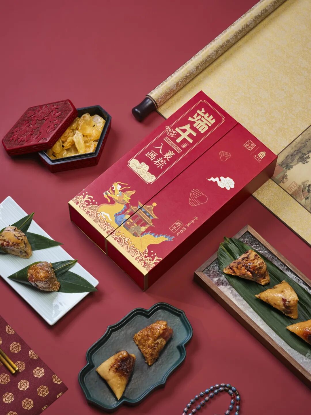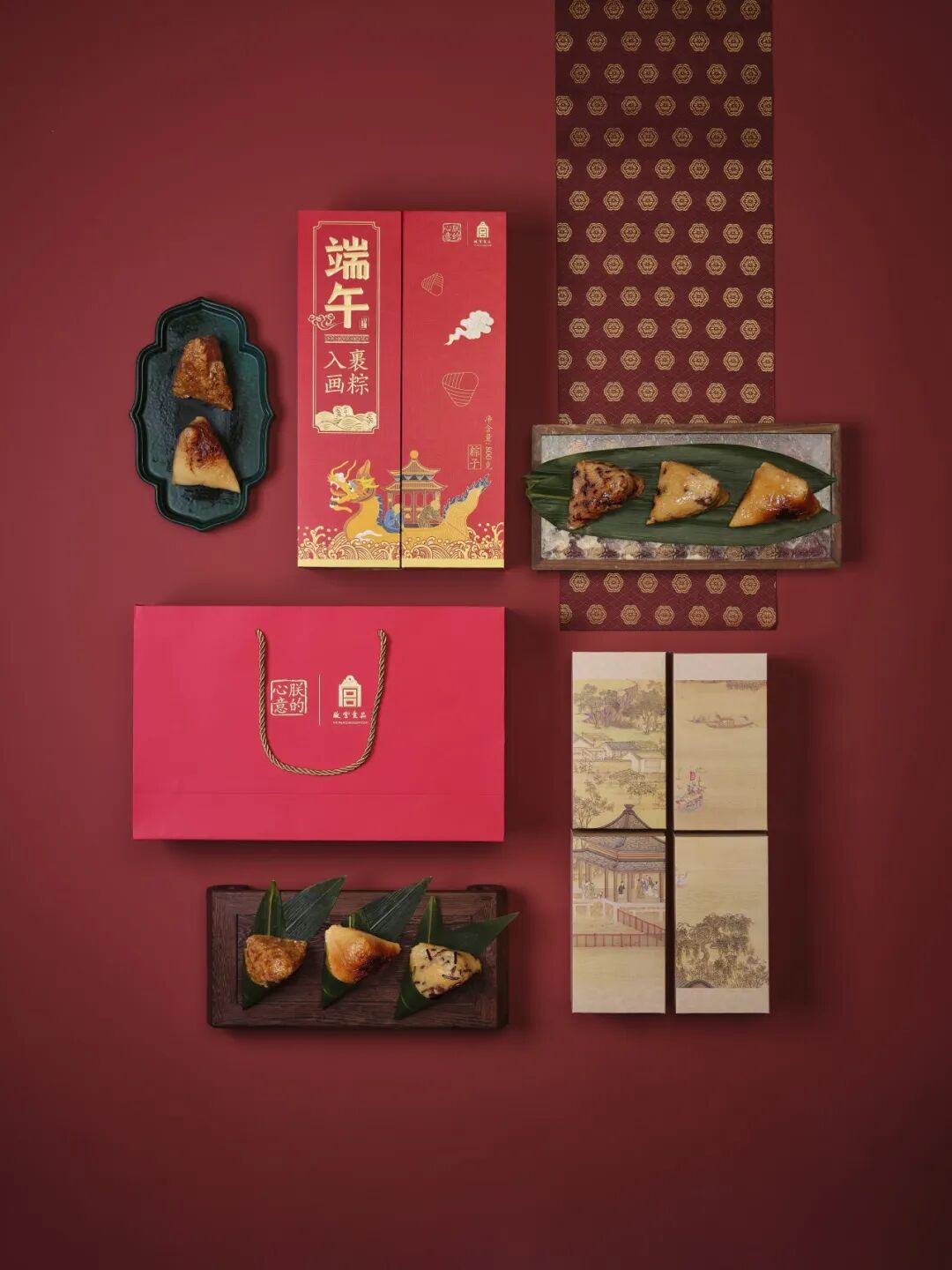 通过结构的优化实现将粽子“卷”入画中的设计理念,凸显礼盒“裹粽入画”的主题。