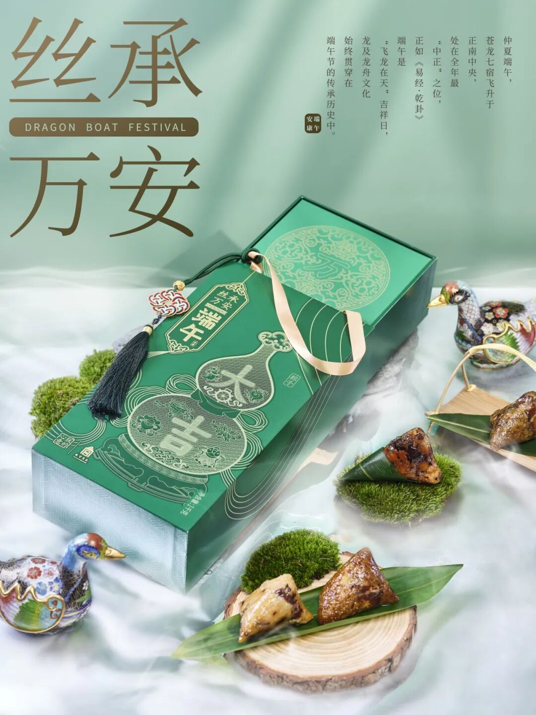 丝承万安礼盒整体色彩具有浓烈的端午氛围,在结构设计上选用手提式抽屉礼盒的结构,更便捷。