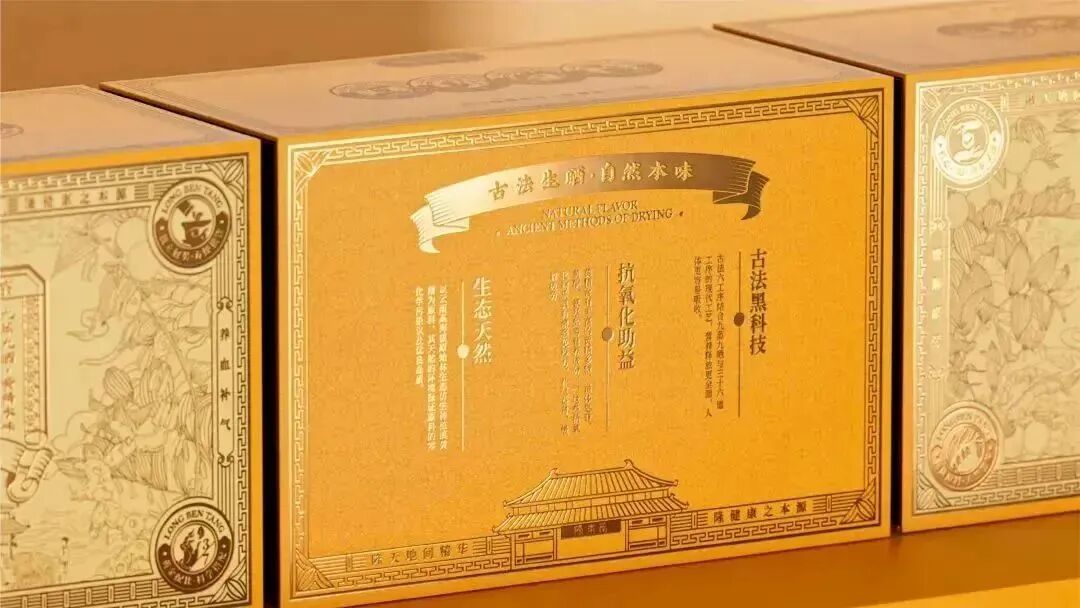 从品牌到产品,我们提炼古代标签的设计风格,结合古代堂号的印象符号,升级品牌标识,将“隆本堂”以堂号牌匾的方式呈现,体现老字号风格的品牌感,极具复古中式色彩。