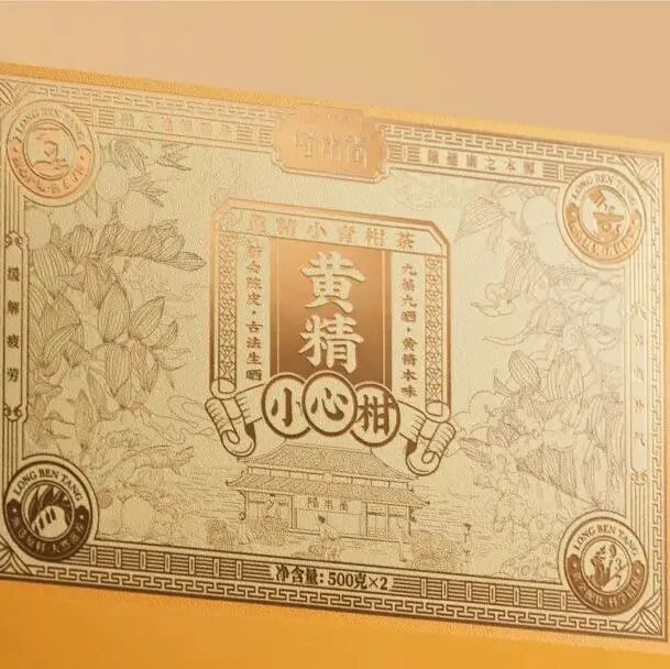 在包装盒主画面的四角以及侧面,我们通过战略花边结合亮点描述,突出黄精小心柑古法技艺、自然本味的卖点,并搭配局部烫金以及凹凸工艺的使用,助力礼盒设计品质感升级。