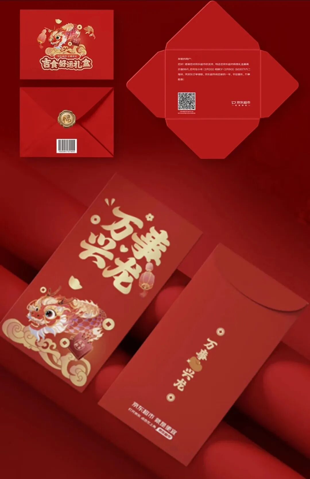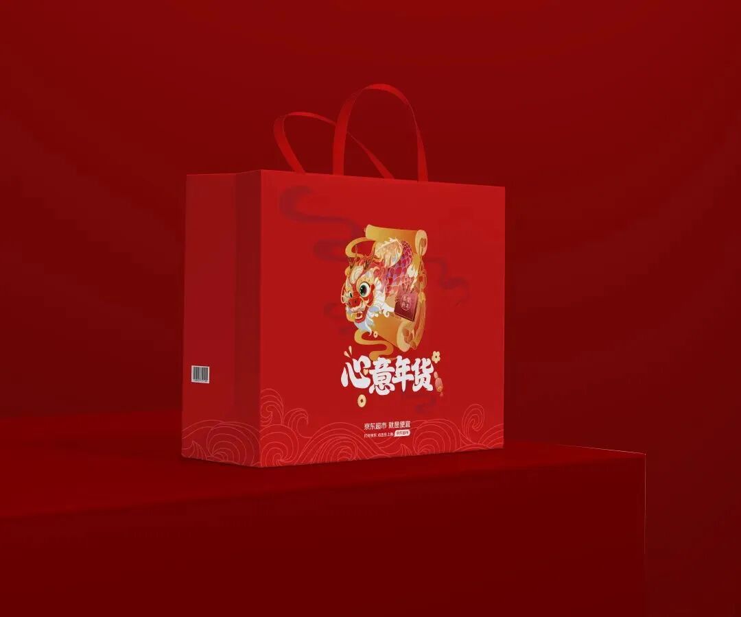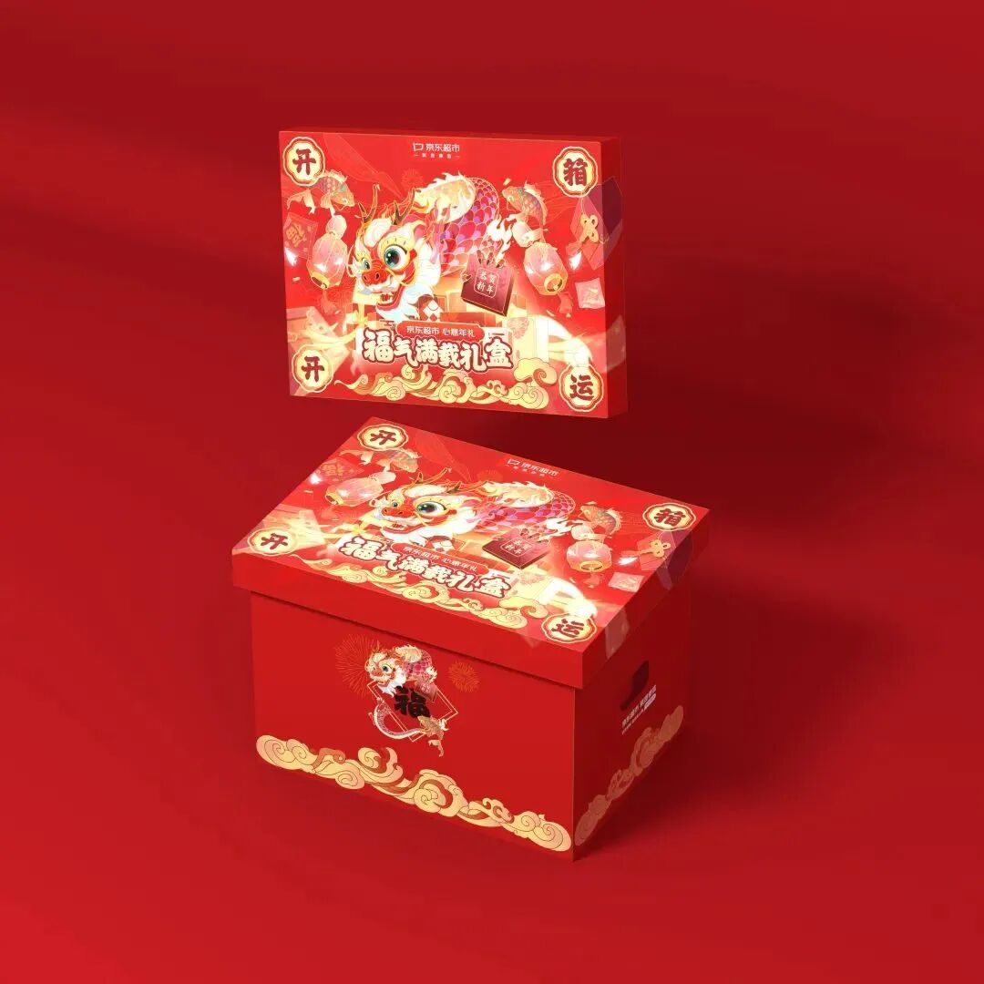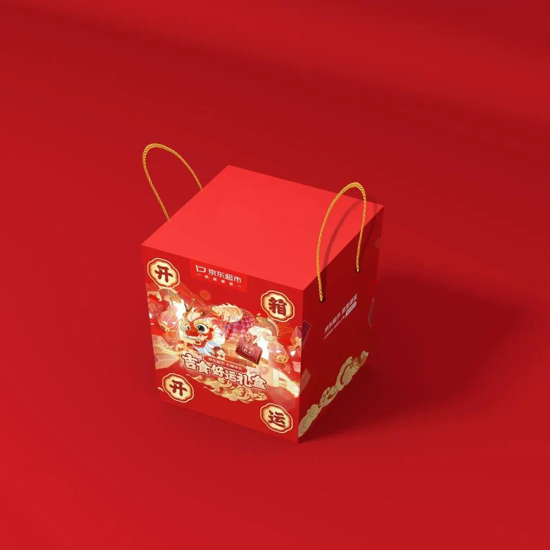 红色在新年设计中无疑是最受欢迎的色彩,其在传统文化中象征吉祥,是年礼包装设计的主打色调。经典的红金配色结合万家灯火,龙送好礼的视觉插画设计,渲染浓浓中国年味。