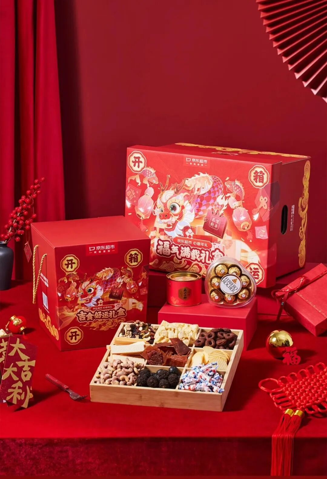 福气满载礼盒的主视觉以及色调沿用了上一款礼盒的设计,此外,画面还结合了经典的福字、纹样元素。