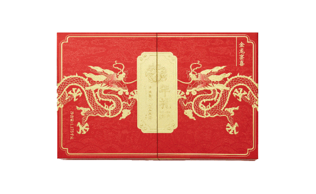 “金龙宴喜”礼盒采用对开门抽屉结构。盒面上,金色双龙身姿矫健犹如披挂金色鳞甲,熠熠生辉。龙首相对,腾飞于祥云与寿山福海之间。向两侧拉开,金龙隐去,大吉葫芦跃然眼前。