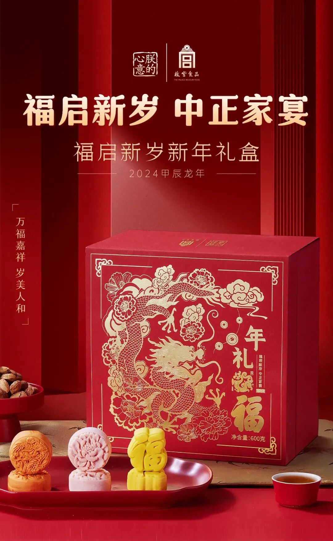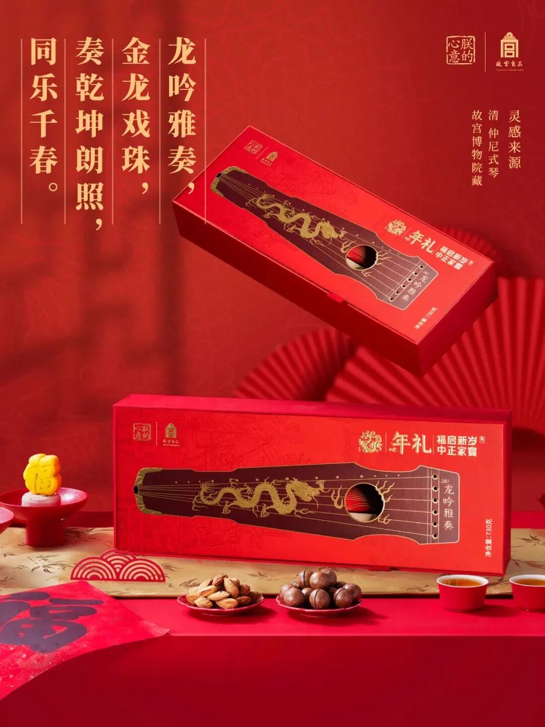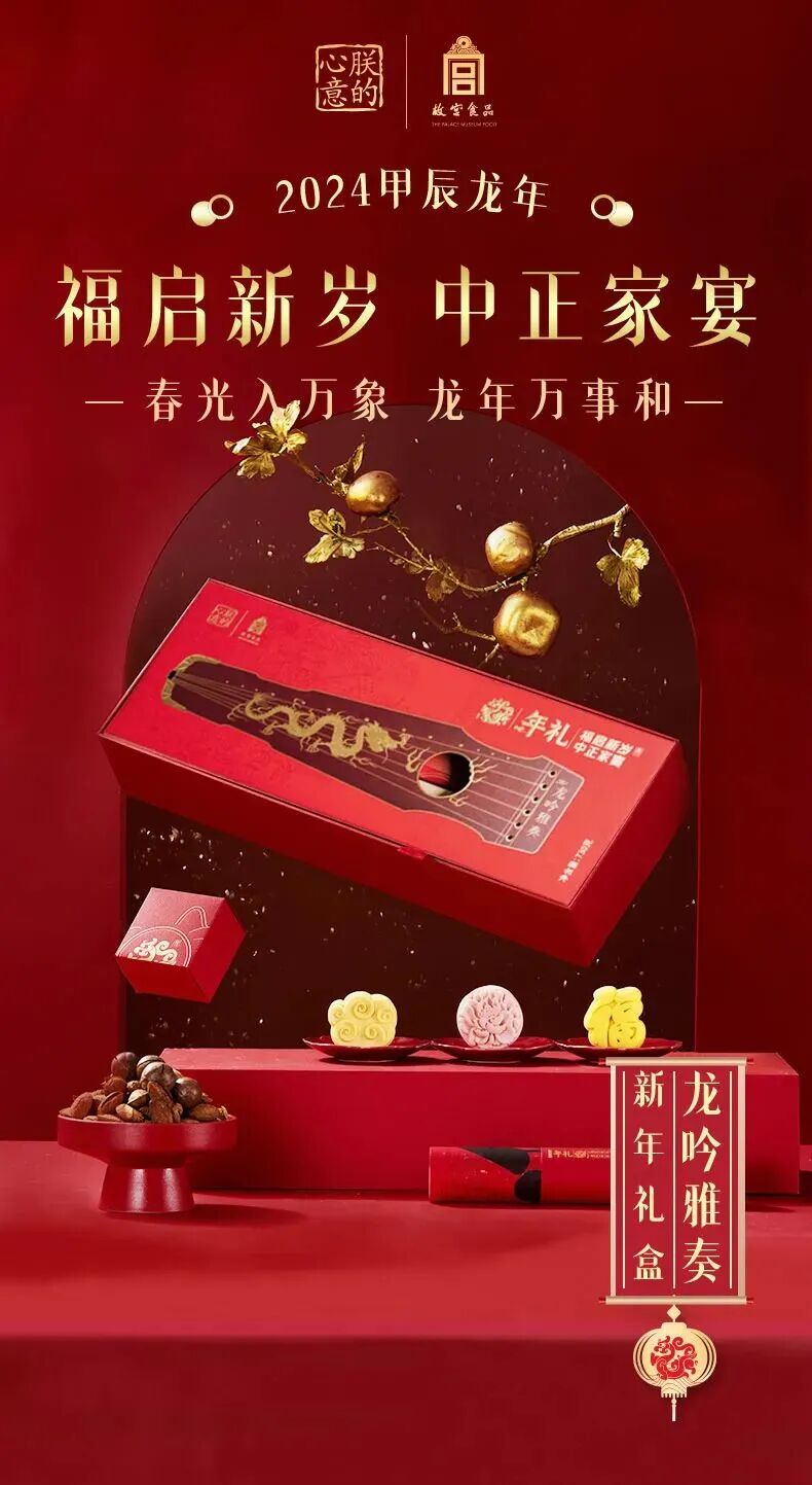 2024甲辰龙年,朕的心意·故宫食品将龙年传统饮食文化、礼文化与现代需求相结合,推出了「龙吟雅奏」、「金龙宴喜」、「云龙曜福」、「福启新岁」四款龙年限定新春礼盒,以现代食礼“赋活”传统,通过现代表达方式令馆藏美学和中国饮食文化,在当代生活中焕发新的生机。