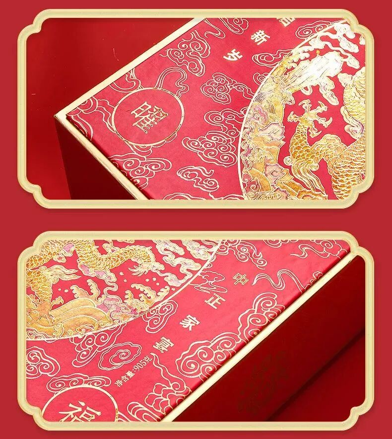 “云龙曜福”礼盒的结构为经典的天地盖式,在外盒工艺上,小象将冷烫工艺、凸字油工艺以及发泡油工艺相结合,赋予了龙纹鎏金般的璀璨质感。同时,通过击烫哑金的工艺,使内盒的迷你龙型图案更圆润、有立体感。