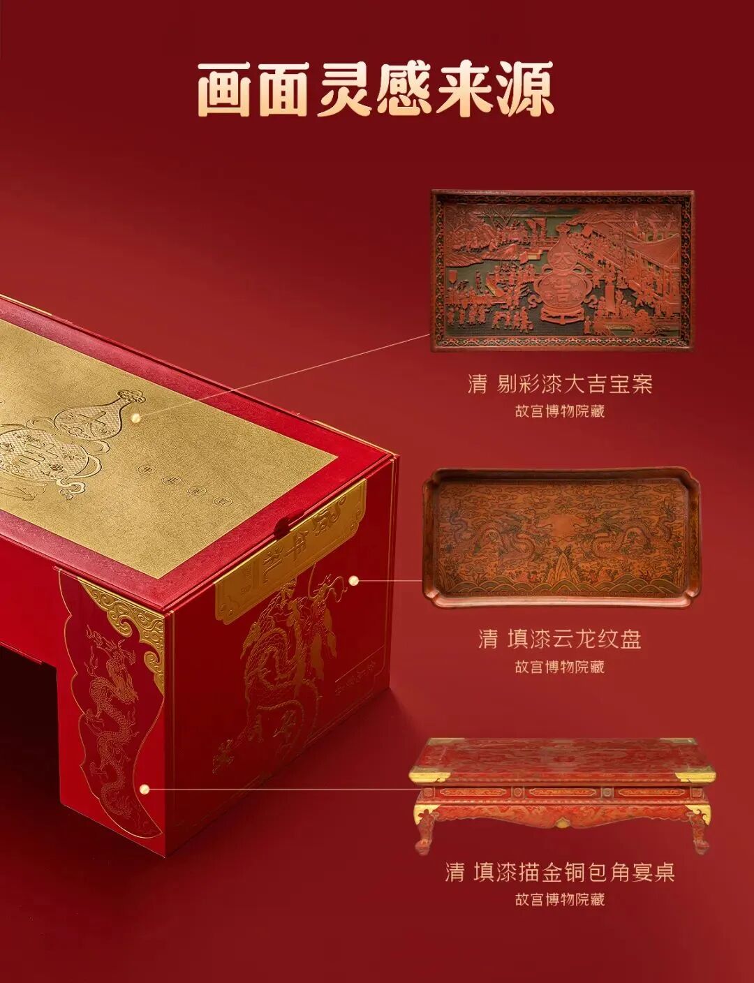 每逢节庆,张筵设席,置酒办馔,是中国人自古以来的习俗。大哉国宴,以中和韶乐奏四海升平。温情家宴,以团圆转宴共融融乐意。“金龙宴喜”新年礼盒立意于宫廷新年期间的各种宴席,从故宫馆藏入手,实现极具宫廷特色文化的造型以及画面设计。