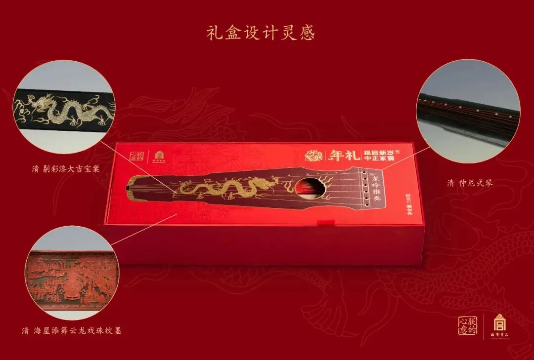 龙吟雅奏新春礼盒的造型设计灵感来源于清代仲尼式琴。琴身龙纹,取自海屋添筹云龙戏珠纹墨。