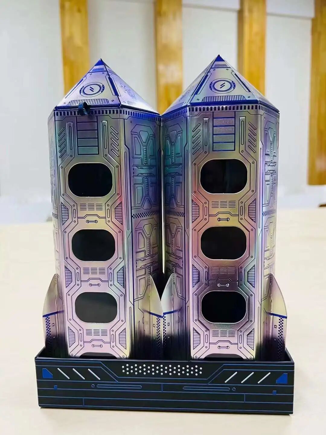 整体礼盒制作过程中,以太空舱结构具化为礼盒盒型,开窗设计能够看到内里的“火箭”,外包装上附着的星辰大海,将航天探索的浪漫与坚守表达出来。