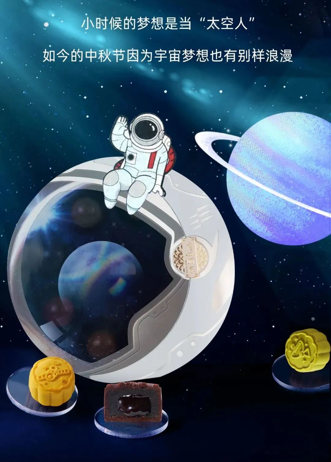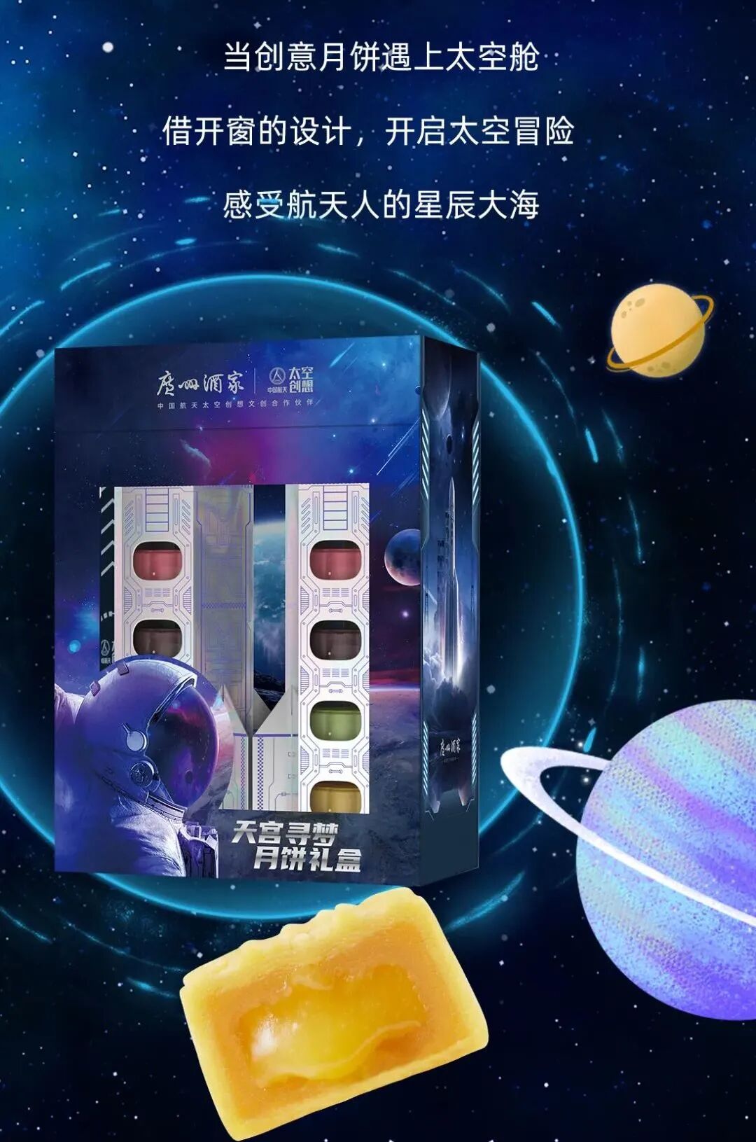 此次广州酒家×中国航天太空创想的两款联名月饼礼盒,通过广式月饼与航天元素碰撞融合,内外兼修,全方位强化月饼礼盒的航天IP属性,从视觉、嗅觉、味觉、触觉满足航天迷对于太空的一切畅想。