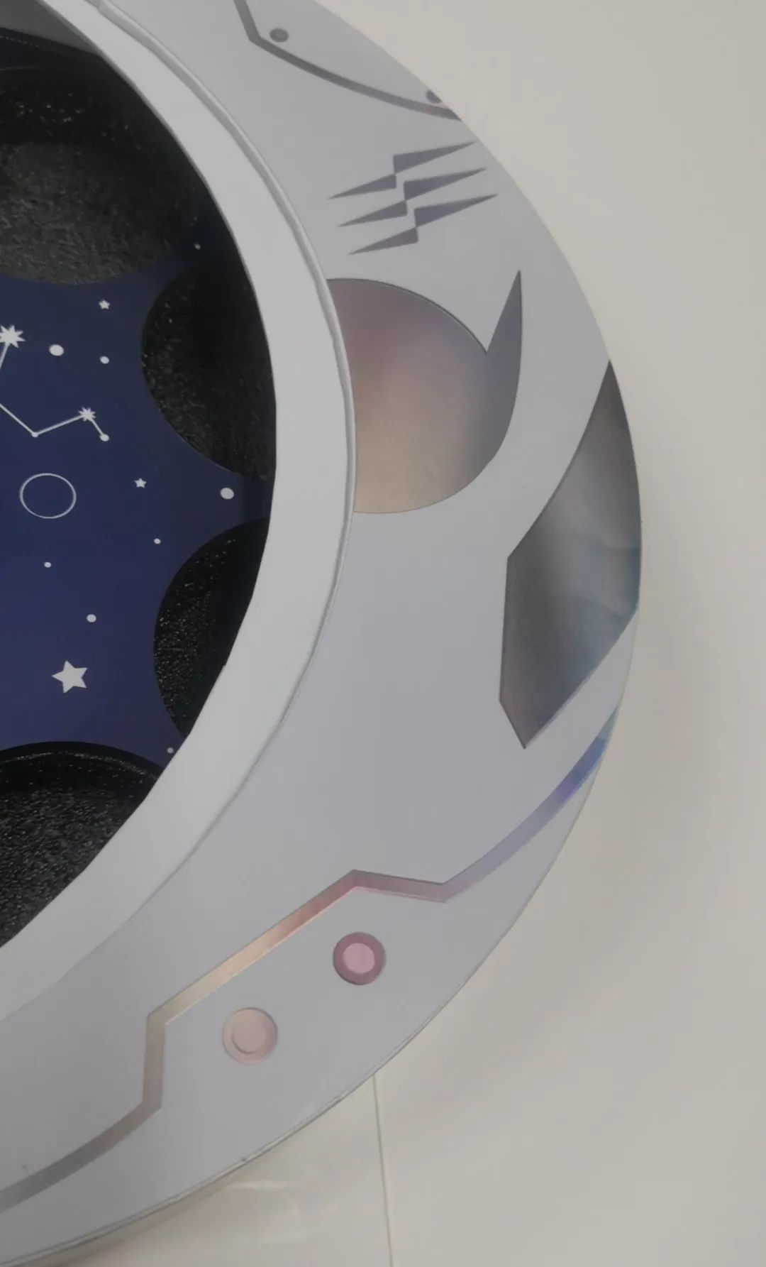 礼盒表面选用素面镭射加光银纸来体现出整体设计理念的金属感,将太空舱的概念传达出来,而在礼盒正面的开窗部分,则选用半透的PET胶片来模拟头盔玻璃的镜面感和透明度,浩瀚宇宙掩映其中,星河烂漫,美轮美奂。