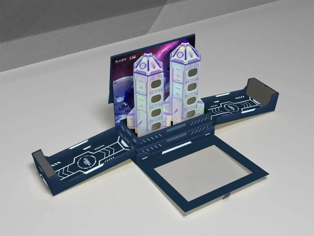 礼盒整体盒型看起来像是一个火箭的发射塔,透过发射塔看到的是航天人的星辰大海,也是火箭静待发射的一瞬间,一近一远,通过近远景的搭配,强化礼盒的航天IP属性,带给消费者沉浸式的航天开盒体验。